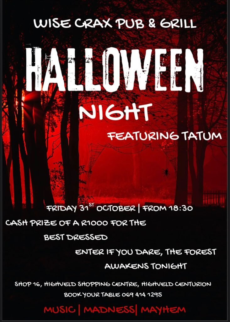 🎃 Step into the Shadows at Wise Crax Pub & Grill! 🎶 This Halloween, the forest awakens and madness takes the mic! Join us on Friday, 31st October from 18:30 for a spine-tingling night of music, mayhem, and mystery featuring the electrifying Tatum live on stage.